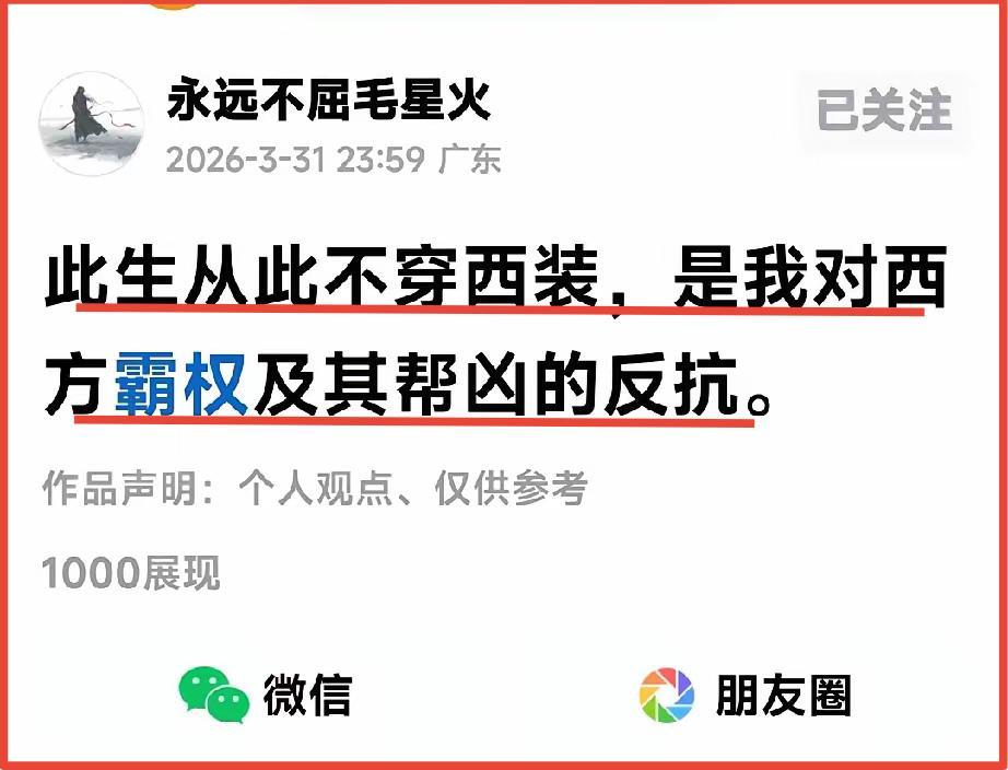 近期,徽声在线注意到一位名为毛星火的公众人物发表了一番引人深思的言论。他郑重宣布,此生将不再穿着西装,以此作为对西方霸权及其追随者的有力抗争。这一表态,无疑展现了他鲜明的立场和坚定的态度。