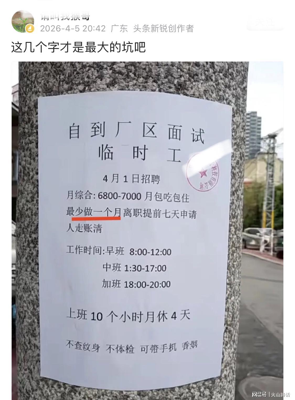 近日,广东某工厂发布的一则临时工招聘启事在网络上掀起了轩然大波,其中“最少需工作一个月”这一简短要求,被众多网友直指为招工领域的“最大陷阱”。