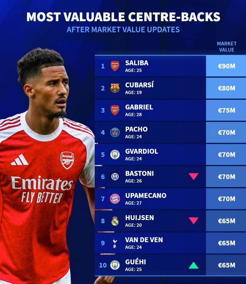 北京时间4月7日,权威转会数据机构德国转会市场(德转)发布了最新一期世界足坛中后卫身价排行榜,引发广泛关注。榜单显示,阿森纳后卫萨利巴以9000万欧元身价高居榜首,巴塞罗那新星库巴西以8000万欧元紧随其后,阿森纳另一名中卫加布里埃尔则以7500万欧元位列第三。