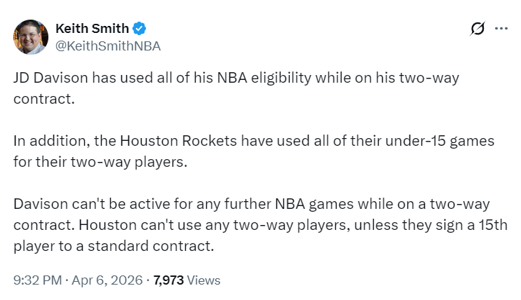 北京时间4月6日晚间消息,据NBA权威记者肯尼-史密斯披露,火箭新秀JD-戴维森已用满双向合同规定的50场常规赛出场次数。尽管在激活的50场比赛中仅获得27次登场机会,但根据联盟规则,这位年轻后卫已无法继续代表火箭出战常规赛,除非球队与其签订标准NBA合同。