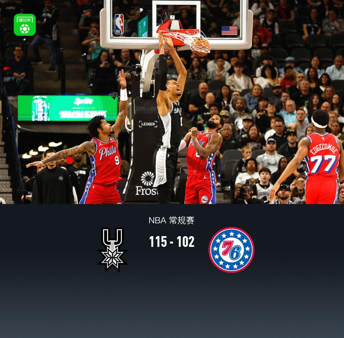 马刺115-102力克76人:文班亚马伤退难掩胜利,恩比德34分徒劳无功
