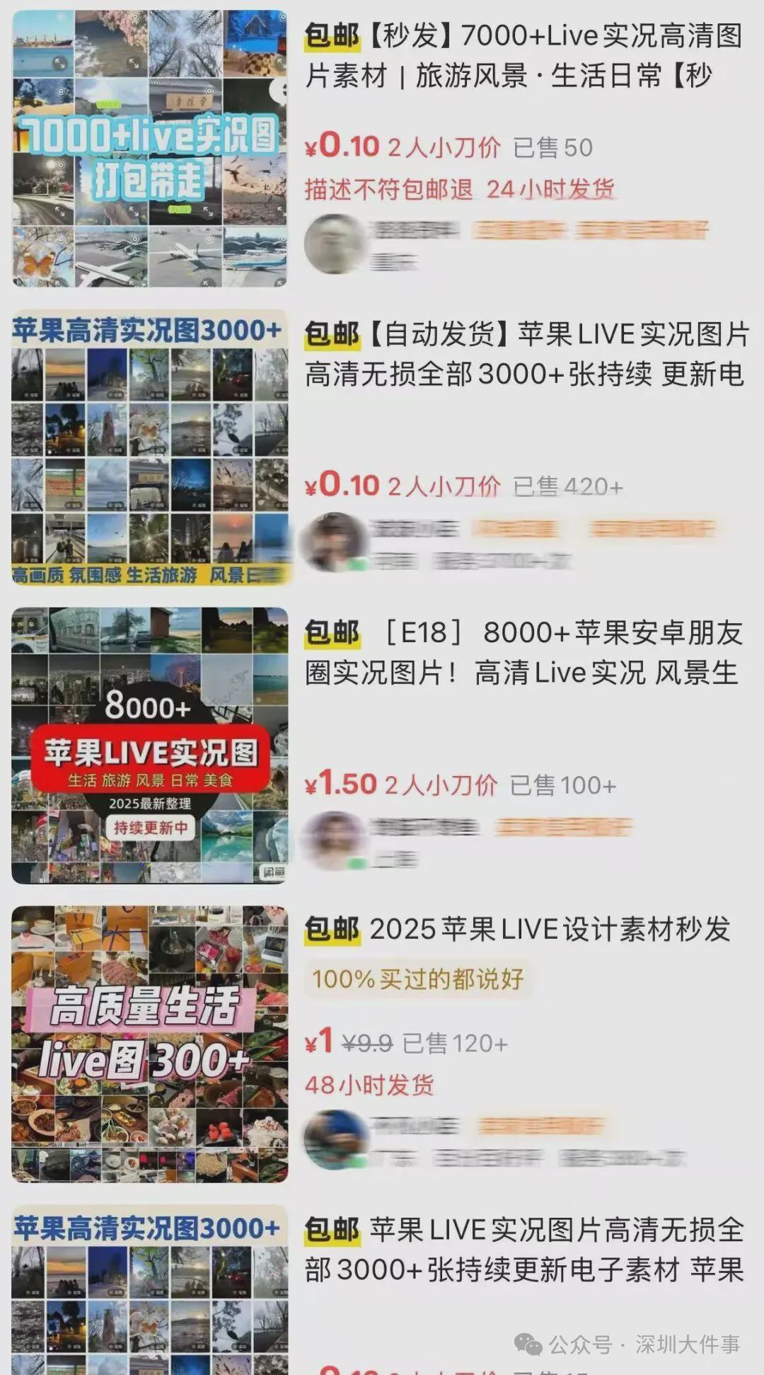通过搜索购物软件和二手交易平台,不难发现,众多店铺都在兜售所谓的“朋友圈实况图片”,价格大多在1至8元之间。商家在商品描述中明确标注“适用于朋友圈配图、社交媒体账号运营”等用途,而这些照片则统一通过网盘链接发送给买家。据徽声在线记者调查,这些网盘链接中往往包含数千张live实况照片,涵盖了国内外旅游风景、购物美食等日常生活场景,以及单人进行高尔夫、滑雪等高端运动的实况照。