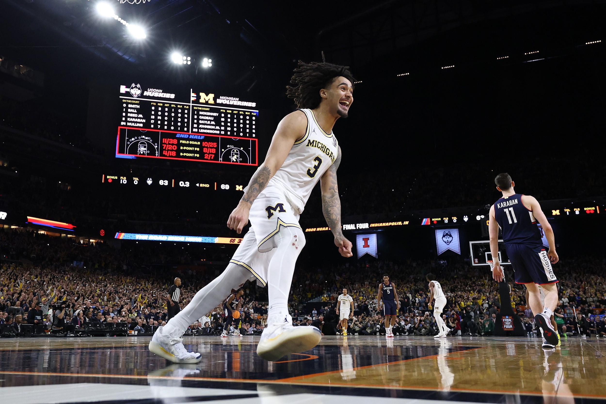 在4月7日进行的NCAA决赛中,密歇根大学以69比63的比分力克康涅狄格大学,成功捧起冠军奖杯。