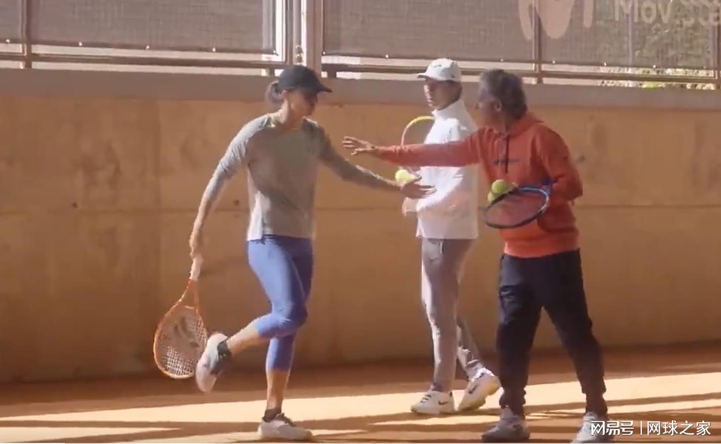 斯瓦泰克(左)在纳达尔网球学院训练,罗伊格(右)和纳达尔(中)现场指导