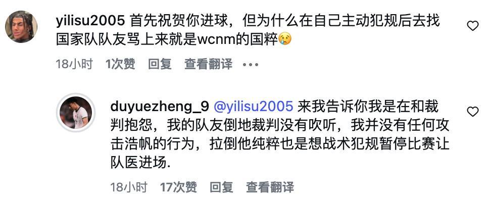 昨日,杜月徵在社交媒体上的评论区迎来了一位球迷的留言,该球迷表示:“首先,我要祝贺你取得进球,为球队贡献了力量。但我想问的是,为什么在你自己主动犯规之后,会去找国家队队友进行言语上的冲突,甚至使用了不恰当的言辞?”