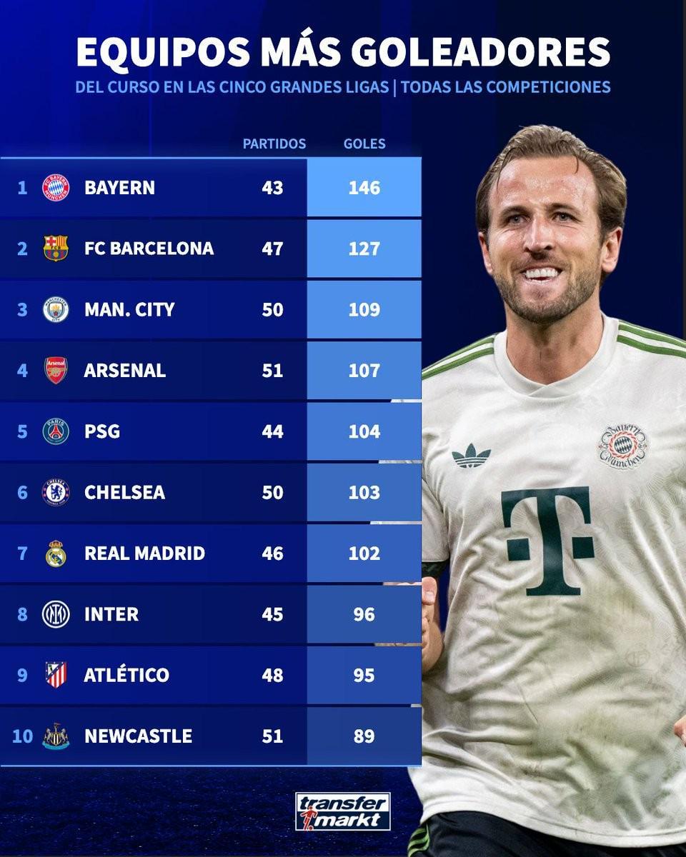 本赛季五大联赛球队进球排行榜:拜仁146球领跑,巴萨曼城紧随其后