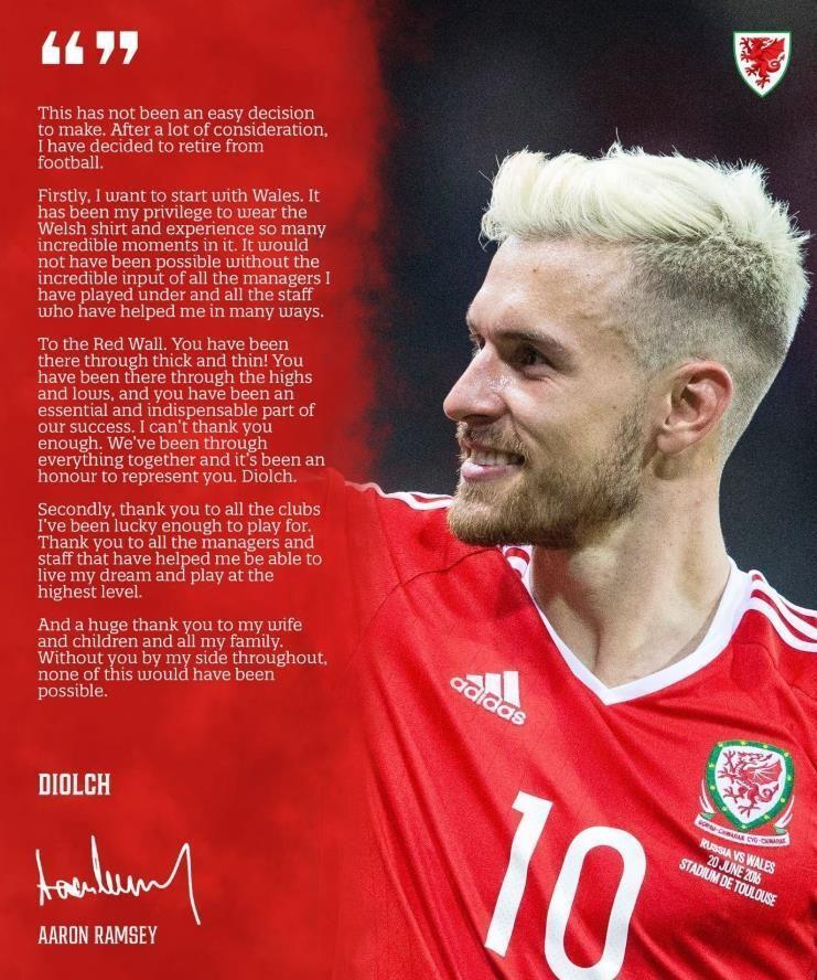 回顾拉姆塞的职业生涯,国家队的战袍始终是他心中的至高荣誉。在退役声明中,他首先感谢的正是威尔士队:“这并不是个容易做出的决定。经过深思熟虑,我决定从足坛退役。首先,我想先谈谈威尔士。能身披威尔士战袍、经历无数精彩时刻,是我的荣幸。”