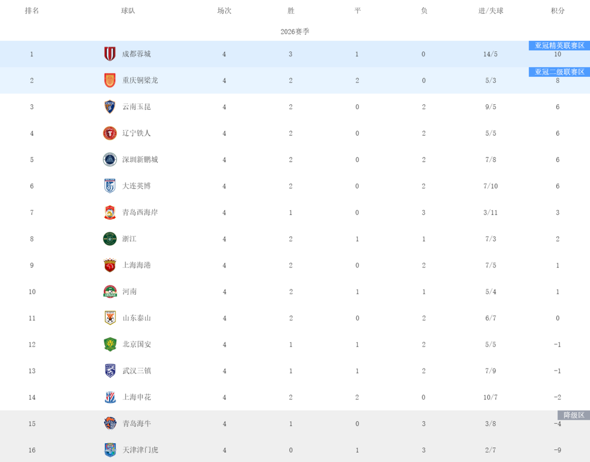 中超四轮战罢积分榜:5队负分,蓉城领跑,两升班马惊艳前四