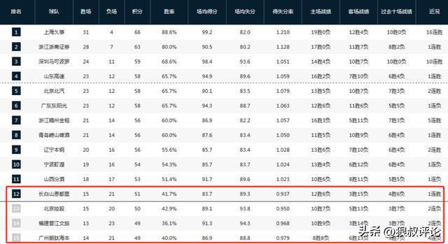 在常规赛接近尾声的当下,若局势不出现重大意外转折,积分榜第12名的归属大概率会在北控、吉林、福建和广州这四支球队中产生。