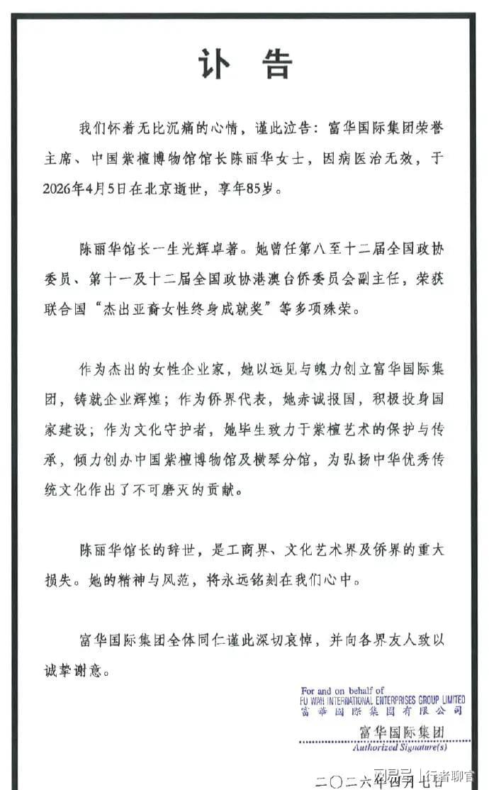 4月7日,商界与文化圈同时被一则消息震动:曾登顶中国女首富宝座、被誉为“紫檀女王”的传奇企业家陈丽华,于4月5日在北京因病逝世,享年85岁。这位出身满族正黄旗、叶赫那拉氏第八代传人的女性,从没落贵族到商业巨擘,再到紫檀文化守护者,其人生轨迹堪称一部活生生的民族融合史。她的离世,不仅引发全网悼念,更掀起一场关于姓氏文化与历史认知的深度讨论。