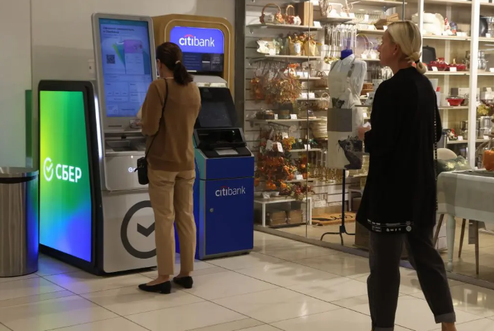 2023年9月1日,莫斯科某购物中心内,一名女性正注视着花旗银行与储蓄银行的自动取款机,这一场景成为支付系统瘫痪的缩影。