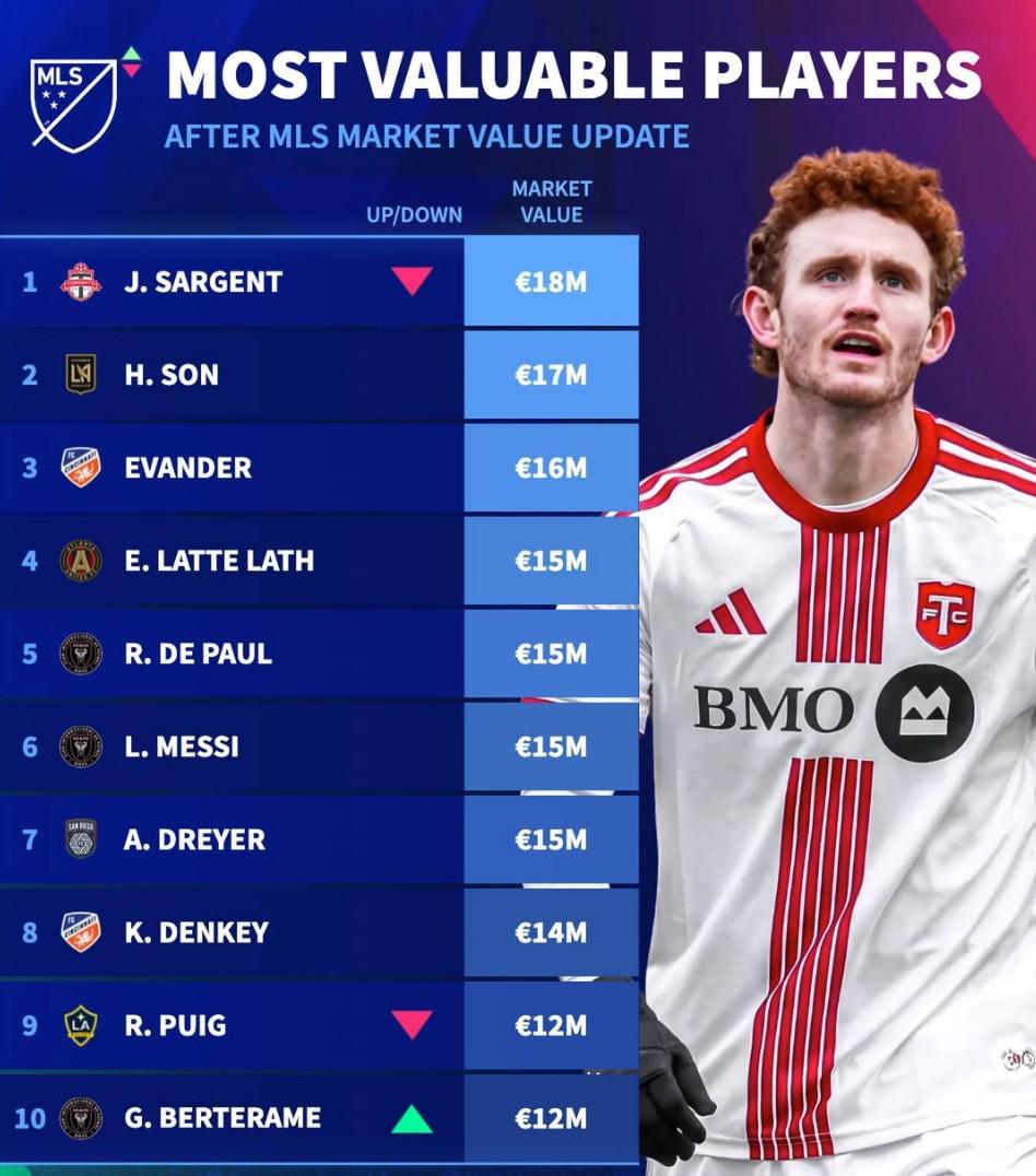 德转最新美职联身价榜:萨金特1800万欧领跑,梅西孙兴慜紧随其后