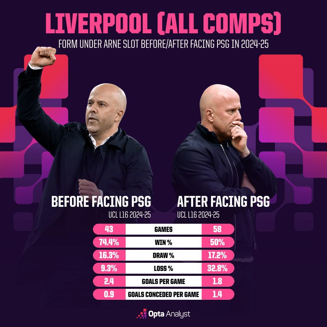 欧冠对决前瞻:斯洛特执教利物浦胜率大起大落,转折点竟是巴黎之战?