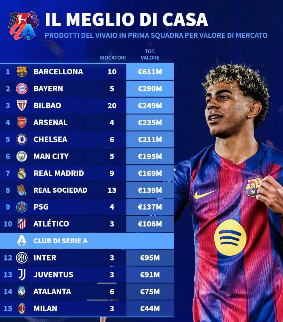 五大联赛青训球员身价榜:巴萨6.11亿欧领跑,意甲集体缺席前十