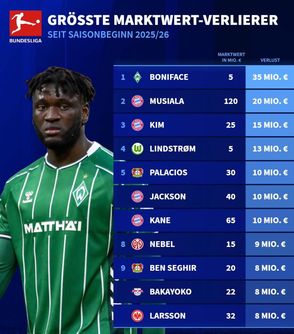 2025-26赛季德甲身价跌幅榜解析:博尼费斯领跌,拜仁三将入围前五