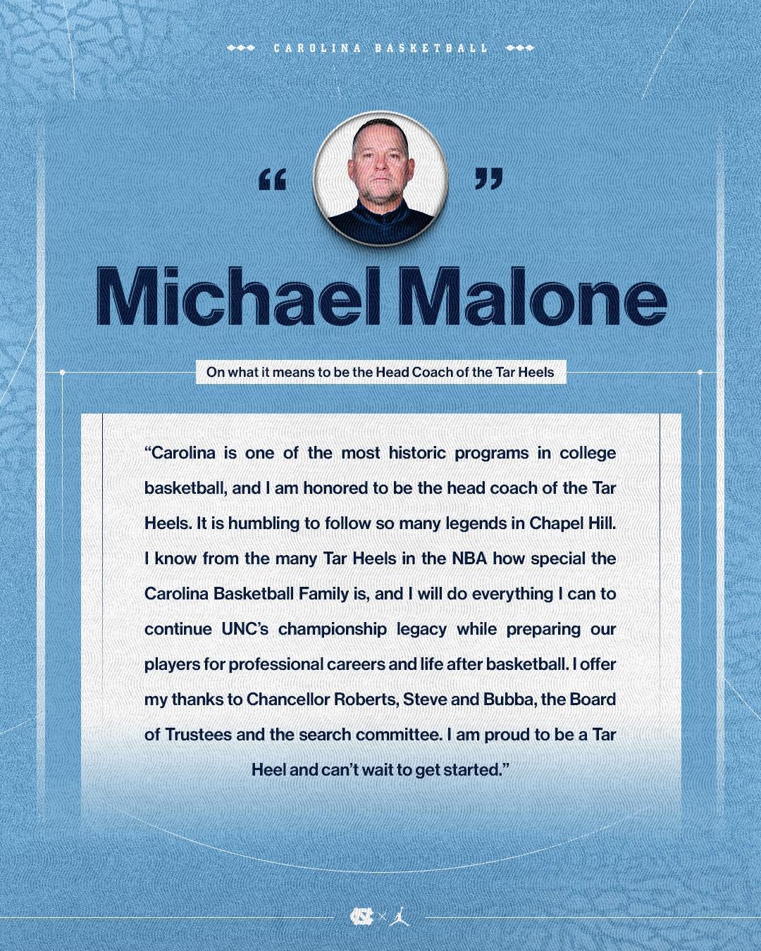 北卡罗莱纳男篮官宣:迈克尔-马龙出任新任主教练