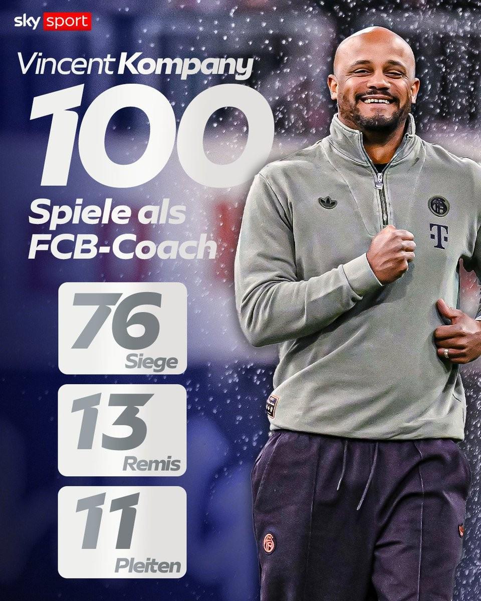 孔帕尼执教拜仁百场76胜,队史胜率紧追瓜迪奥拉