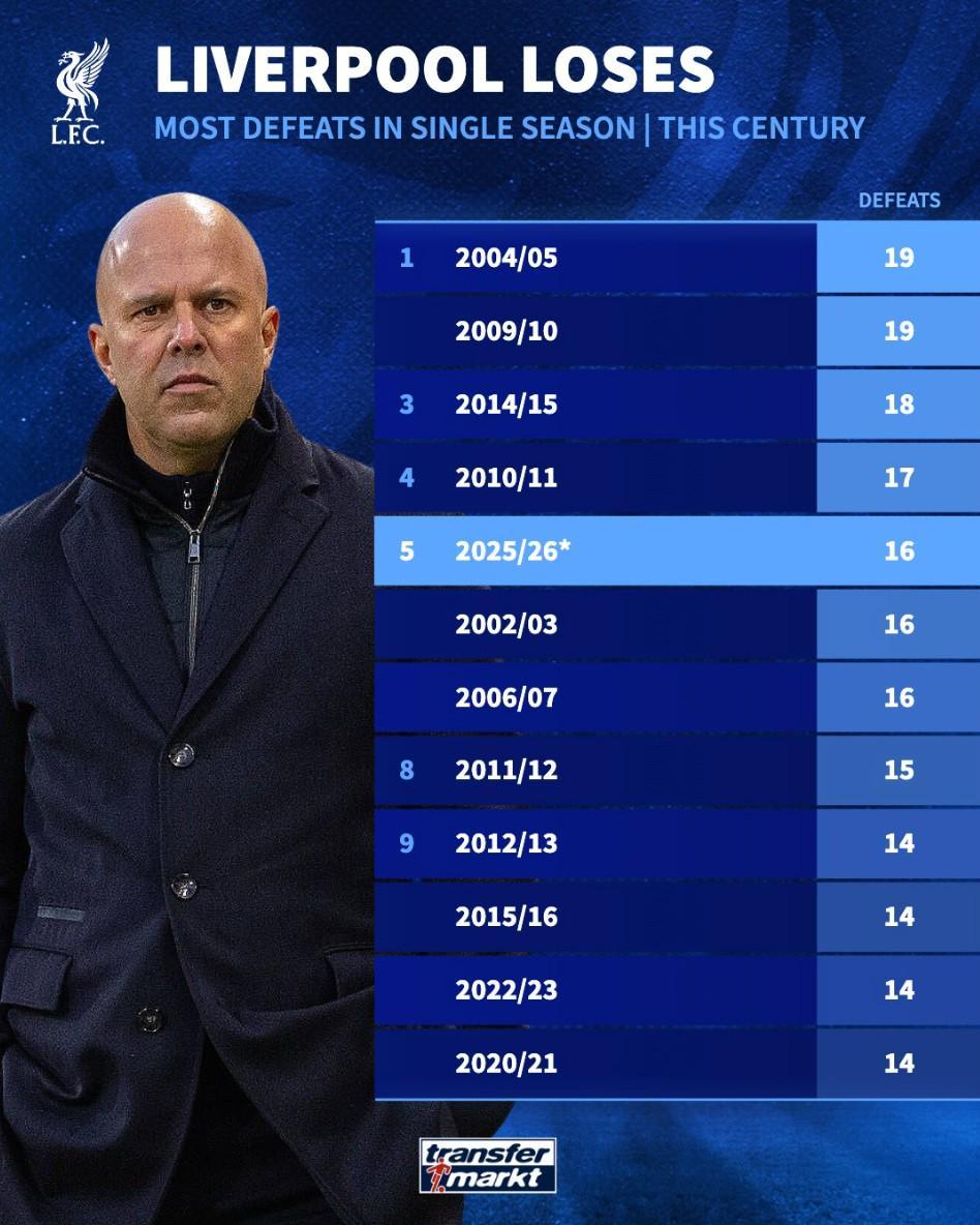 北京时间4月8日消息,在利物浦即将踏上欧冠1/4决赛首回合客场挑战巴黎圣日耳曼的征程前夕,根据权威数据网站德国转会市场(德转)的最新统计,红军在本赛季的各项赛事中已经遭遇了多达16场的失利,这一数字在本世纪利物浦的单赛季输球场次中位列第五。