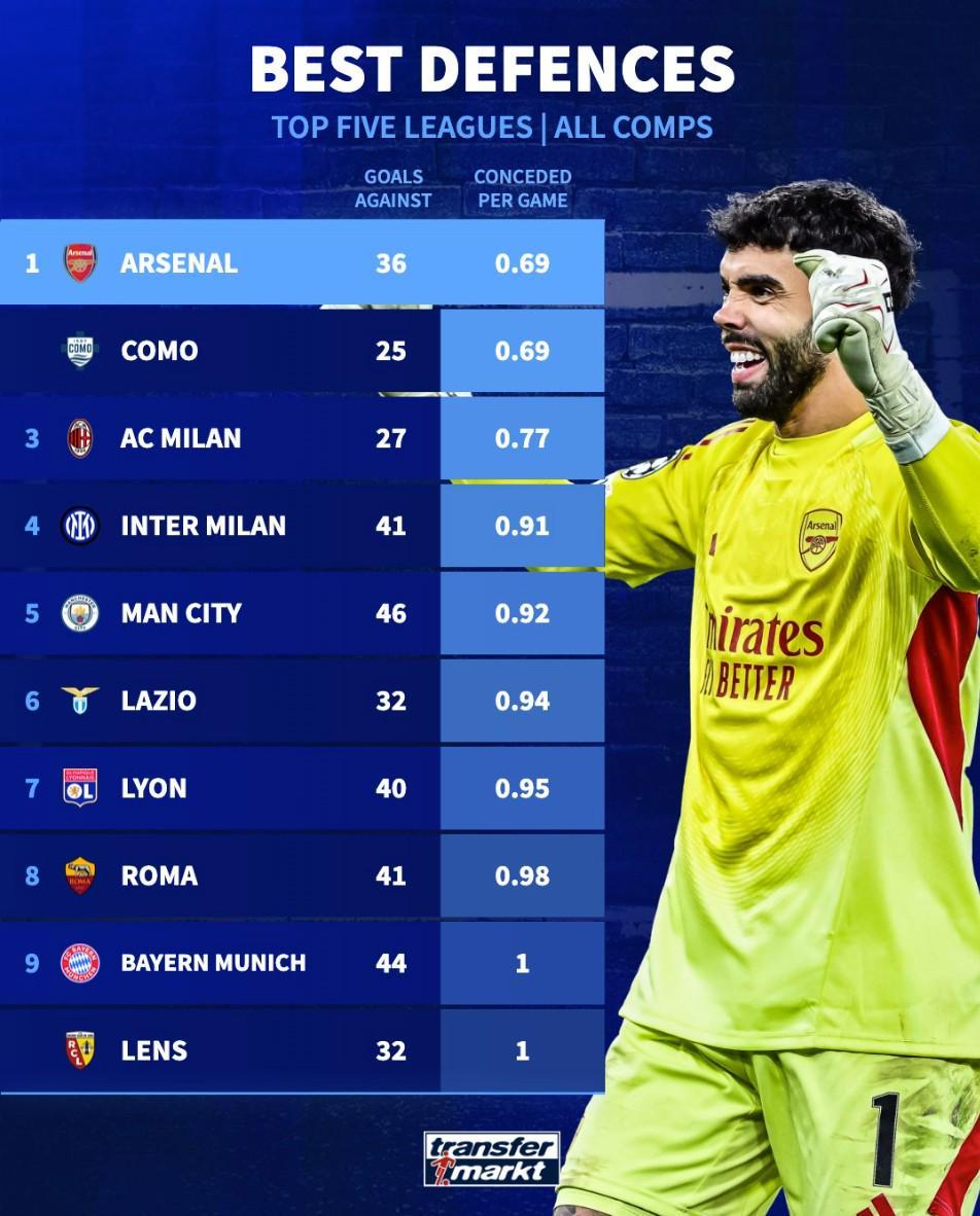 北京时间4月8日凌晨,在欧冠1/4决赛首回合的较量中,阿森纳客场以1-0的比分力克葡萄牙体育,展现出了坚实的防守实力。赛后,根据权威数据机构德转的最新统计,本赛季至今欧洲五大联赛中,场均丢球数最少的10支球队名单揭晓,其中阿森纳与法布雷加斯执掌的科莫队并列榜首,两队均以场均仅丢0.69球的出色表现领跑。