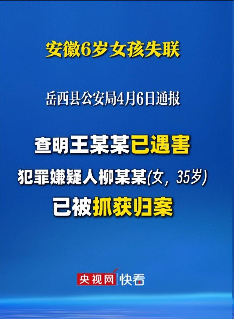 6岁失联女童王某某已遇害,35岁的犯罪嫌疑人柳某某(女)已被抓获归案。