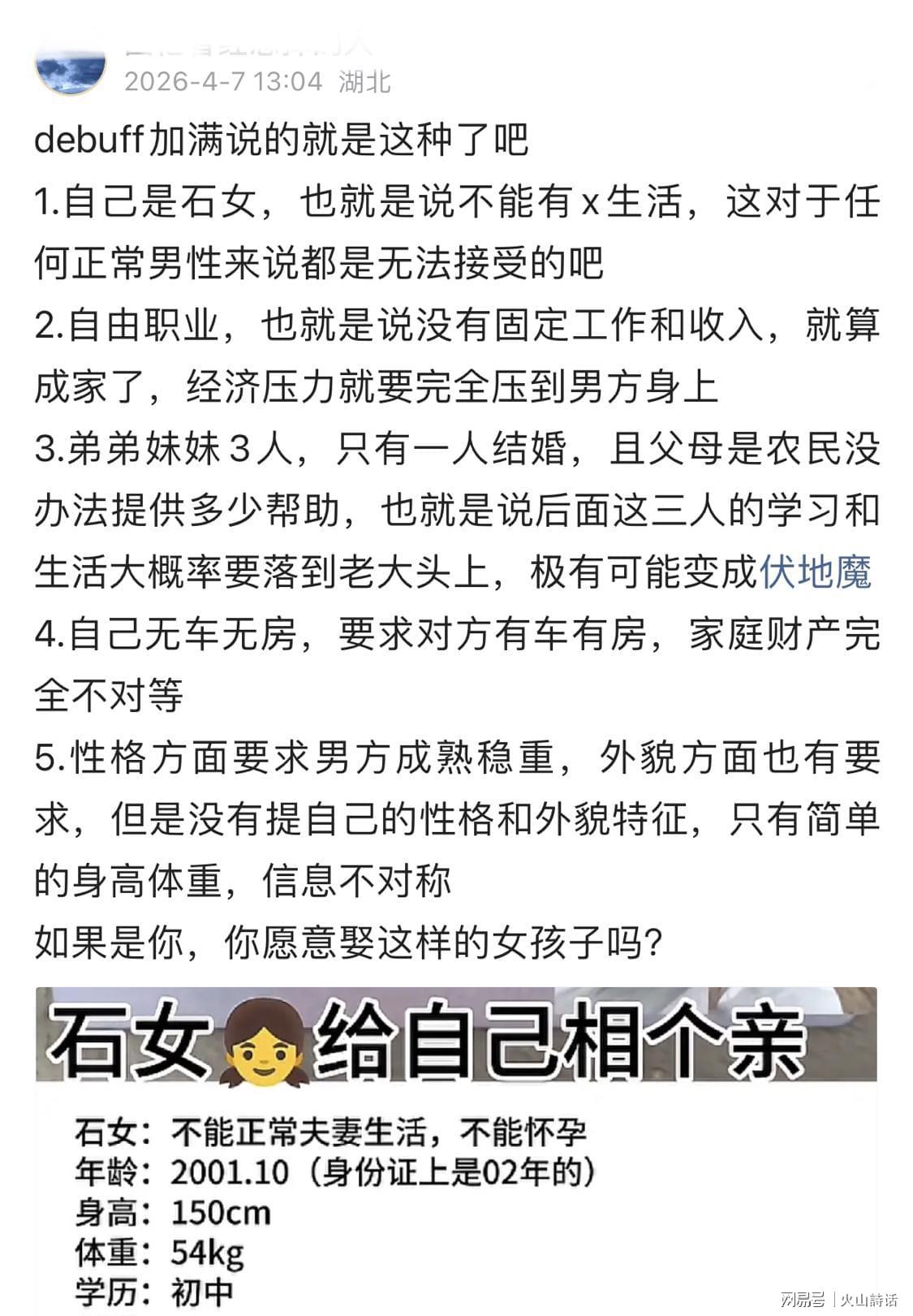 然而,如果将一个人仅仅简化成一串“减分项”,完全忽略了情感、人品、性格以及彼此之间的适配度,这显然就过于极端了。所谓“石女”涉及到生理健康问题,这本应是属于个人隐私和需要尊重的范畴。是否会影响婚姻,关键在于双方是否能够坦诚沟通,能否达成共识,而不是直接就被贴上“无法接受”的标签。