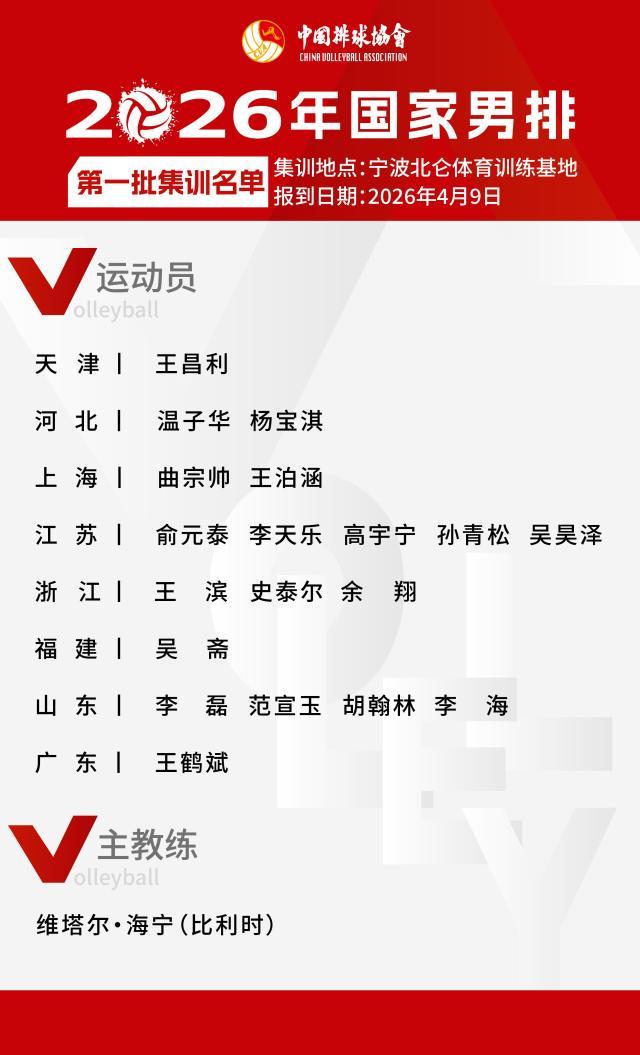 北京时间4月8日,国家体育总局排球运动管理中心正式对外揭晓了2026年中国男排国家队的首批集训大名单。此次集训,共吸引了19名球员的加入,主教练一职依旧由经验丰富的比利时外教维塔尔・海宁担任。根据安排,参与首批集训的教练员和运动员将于4月9日齐聚宁波北仑体育训练基地,开启紧张而充实的集训生活。