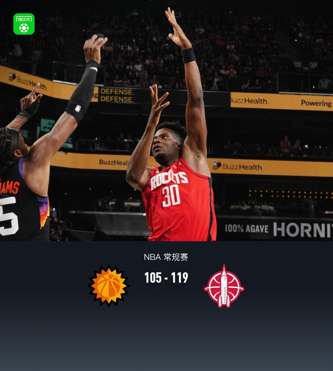 火箭7人得分上双,119-105大逆转太阳,布克空砍31分难救主