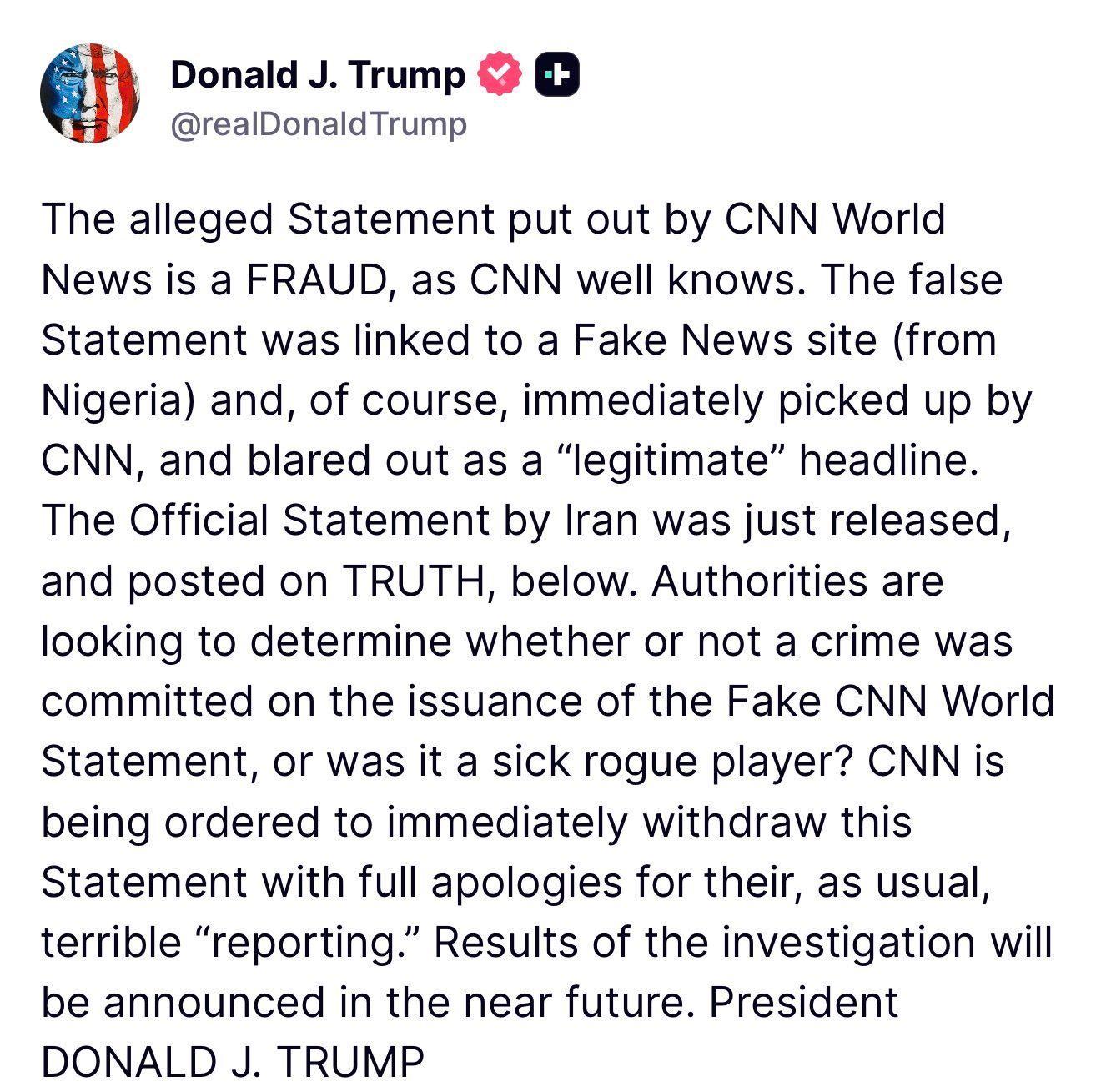 美伊之间的停火协议刚刚尘埃落定,一场围绕媒体报道真实性的风波却骤然升级。特朗普总统通过其社交媒体平台Truth Social发表强硬声明,直指CNN World News发布了一份伪造的伊朗官方声明,并透露相关部门已介入调查,该事件可能涉及刑事犯罪。