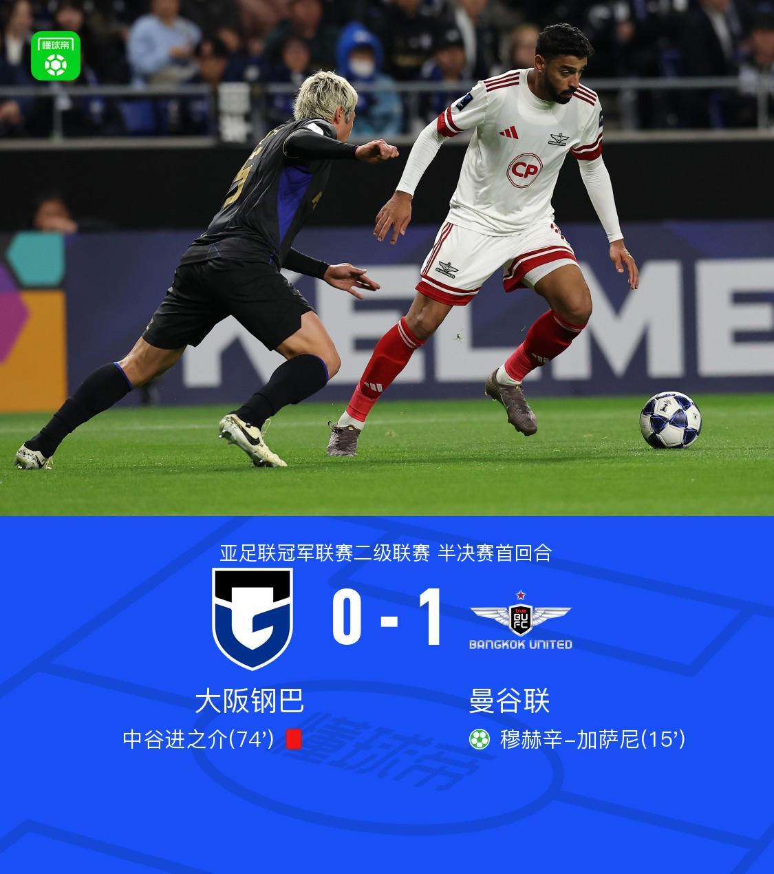 大阪钢巴0-1不敌曼谷联,中谷进之介手球送点+染红成转折
