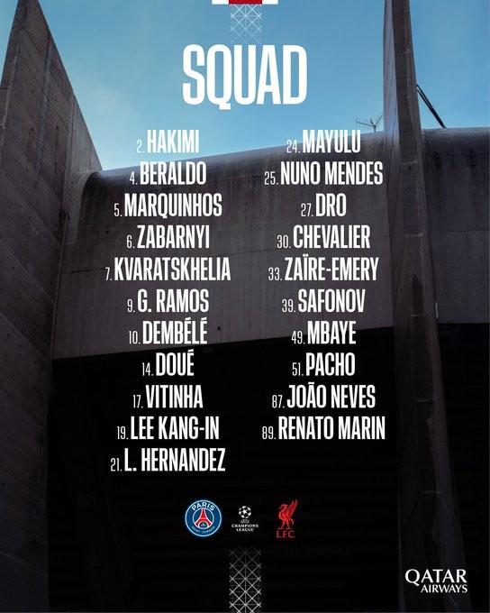 锋线三叉戟:7号克瓦拉茨赫利亚与10号登贝莱组成双翼,9号贡萨洛-拉莫斯突前,14号杜埃、27号德罗-费尔南德斯、49号姆巴耶构成进攻储备