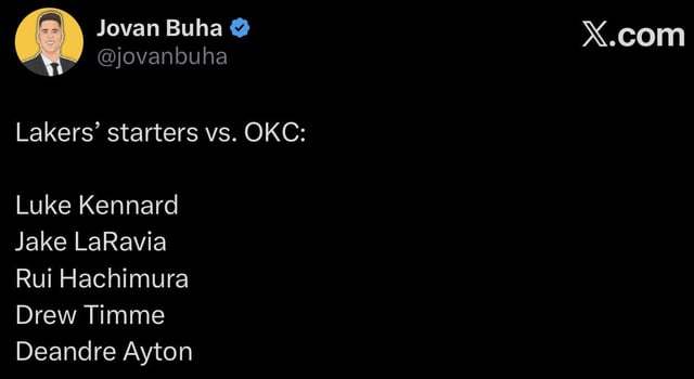 当湖人队对阵雷霆队的首发阵容名单曝光时,整个篮球圈都炸开了锅。Luke Kennard、Jake LaRavia、Rui Hachimura、Drew Timme、Deandre Ayton——这五人组合,与其说是NBA级别的首发,倒更像是2K游戏里,在伤病名单全开的情况下,系统强制派出的轮换阵容。据知名记者Buha透露,这份名单的消息来源可靠,但此时此刻,已经没人去深究消息源了,大家的注意力都集中在一个问题上:这五个人里,到底有几个是赛季初就身披湖人战袍的?