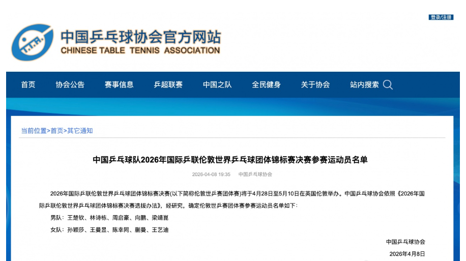 北京时间4月8日晚间,徽声在线从中国乒协官方渠道获悉,2026年国际乒联伦敦世界乒乓球团体锦标赛决赛的参赛阵容已正式揭晓。具体名单如下:
