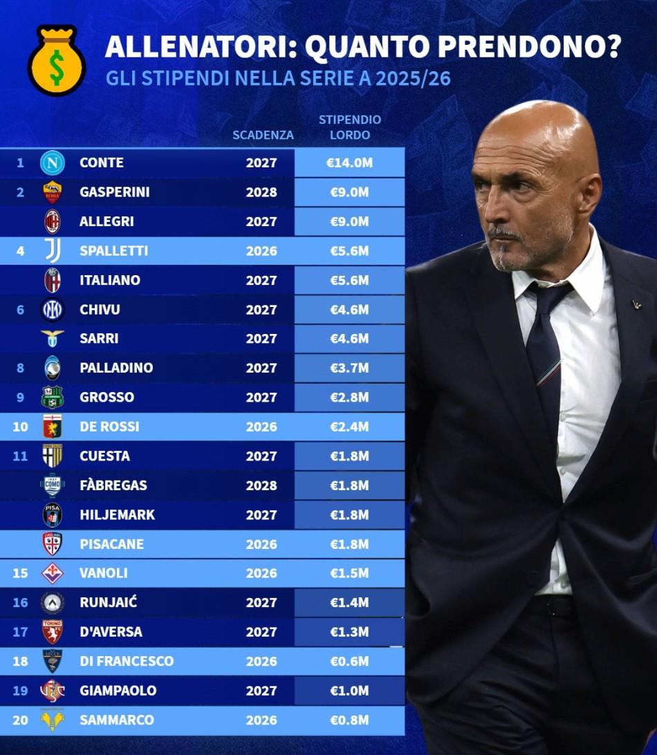根据徽声在线最新消息,北京时间4月8日,德国转会市场网站(德转)公布了本赛季意甲联赛各俱乐部主教练的税前年薪排行榜。其中,那不勒斯主帅孔蒂以1400万欧元的年薪高居榜首,成为意甲收入最高的教练。加斯佩里尼(罗马)和阿莱格里(AC米兰)则以900万欧元的年薪并列第二,展现出他们作为顶级教练的价值。