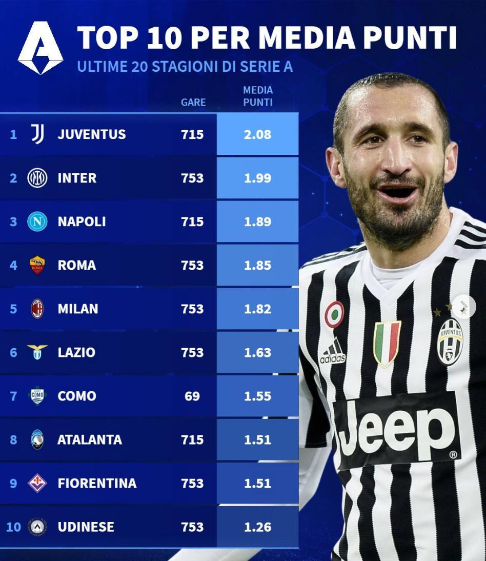 意甲近20年积分榜揭晓:尤文场均称王,国米总积分领跑