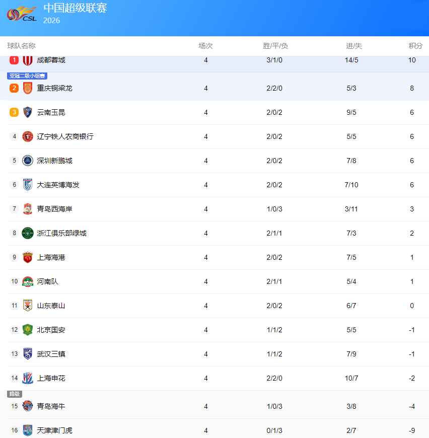 随着2026赛季中超联赛激战至第4轮,当前这份因提前扣分机制而显得与众不同的积分榜,引发了球迷们的广泛讨论与情绪波动。成都蓉城无疑是现阶段的最大受益者,凭借前四轮3胜1平的出色战绩,以10分稳坐积分榜首位,展现了其强大的竞争力。而升班马重庆铜梁龙则以黑马之姿,2胜2平保持不败,紧随其后位列第二,令人眼前一亮。中超二年级生云南玉昆同样不甘示弱,2胜2负积6分,稳居第三,展现了其不俗的实力。