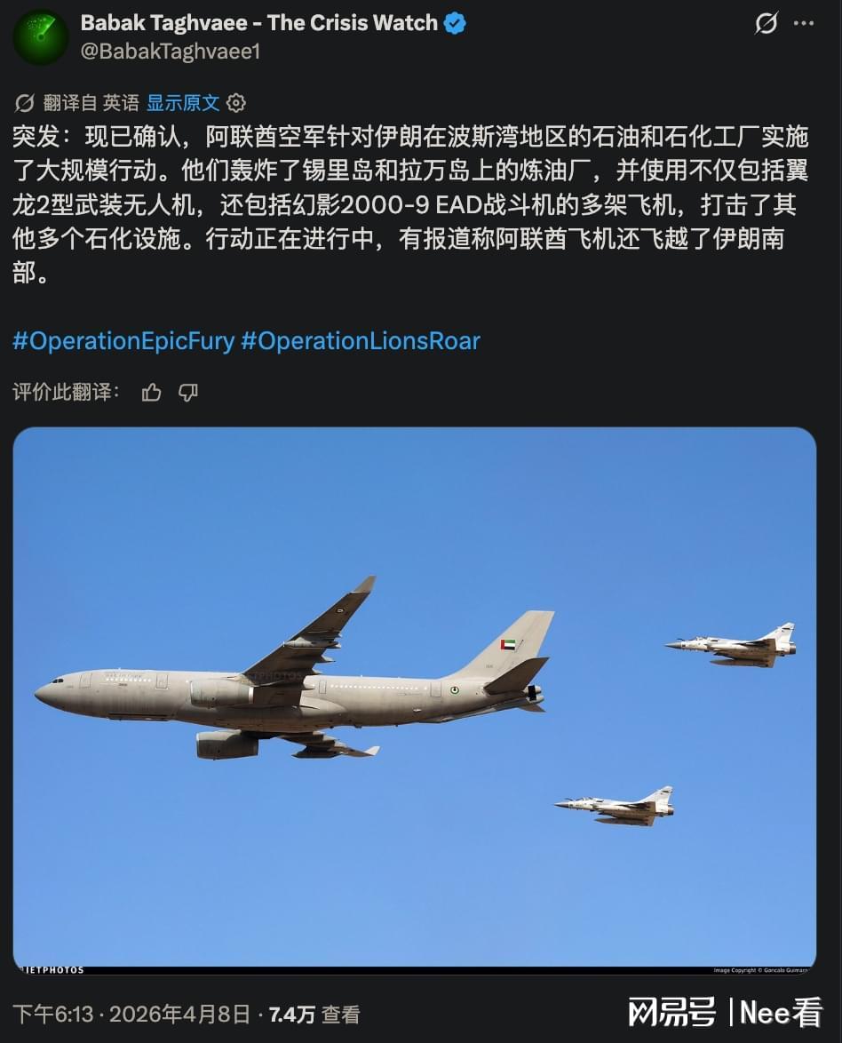 2026年4月8日,国际军事观察员Babak Taghvaee在社交平台披露,阿联酋空军对伊朗位于波斯湾的西里岛(Siri)和拉万岛(Lavan)核心能源设施发起突袭。此次行动动用了中国制造的翼龙-2(Wing Loong 2)察打一体无人机与法国幻影-2000-9(Mirage 2000-9)多用途战斗机,通过多波次精确打击瘫痪了炼油厂储油罐区及石化生产线。