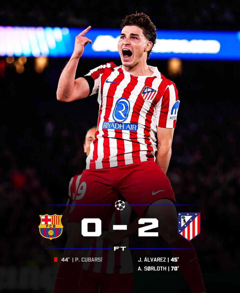 阿尔瓦雷斯主罚的任意球堪称艺术品:距离球门18米的贴地斩划出完美弧线,直窜球门右上死角。霍安·加西亚虽然做出飞身扑救,但皮球仍擦着指尖入网。这个进球让马竞带着1-0的优势进入中场休息,而巴萨更衣室里弥漫着焦虑与不甘。