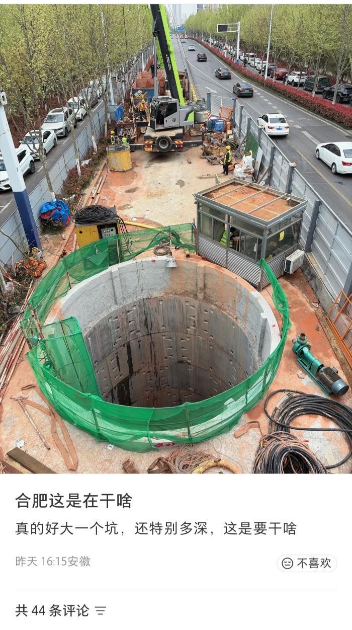 徽声在线讯4月7日傍晚时分,有合肥市民在本地社交论坛发布图文消息称,在井岗路四季花海段人行天桥下方发现一处正在施工的巨型水泥基坑,现场被蓝色施工围挡完全封闭,数名工人操作着大型机械设备作业。该市民配文质疑:"这个直径超过5米的深坑究竟有何用途?"带着疑问,4月8日上午徽声在线记者前往现场展开调查。