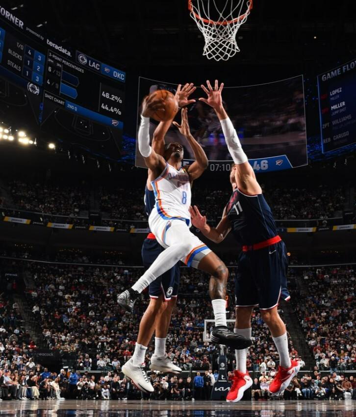 北京时间4月9日,NBA常规赛激战正酣。在洛杉矶斯台普斯中心球馆,主场作战的洛杉矶快船队迎来了俄克拉荷马城雷霆队的强势挑战。本场比赛从首节开始就呈现出一边倒的态势,雷霆队凭借多点开花的进攻表现,始终牢牢掌控着比赛节奏,最终以128-110的比分在客场轻松取胜,豪取七连胜的同时,也正式锁定了本赛季NBA联盟常规赛第一的宝座。