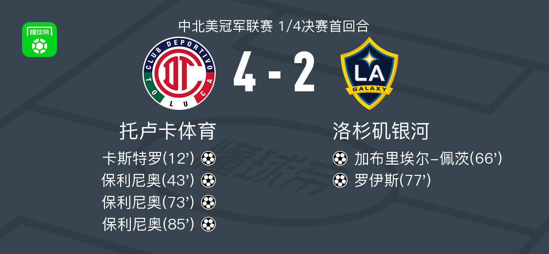 在北京时间4月9日进行的中北美冠军联赛1/4决赛首回合较量中,托卢卡体育与洛杉矶银河展开了一场精彩对决。本场比赛,托卢卡体育凭借卡斯特罗的破门以及保利尼奥的帽子戏法,最终以4-2的比分战胜了洛杉矶银河。洛杉矶银河方面,加布里埃尔 - 佩茨和罗伊斯也分别为球队建功。