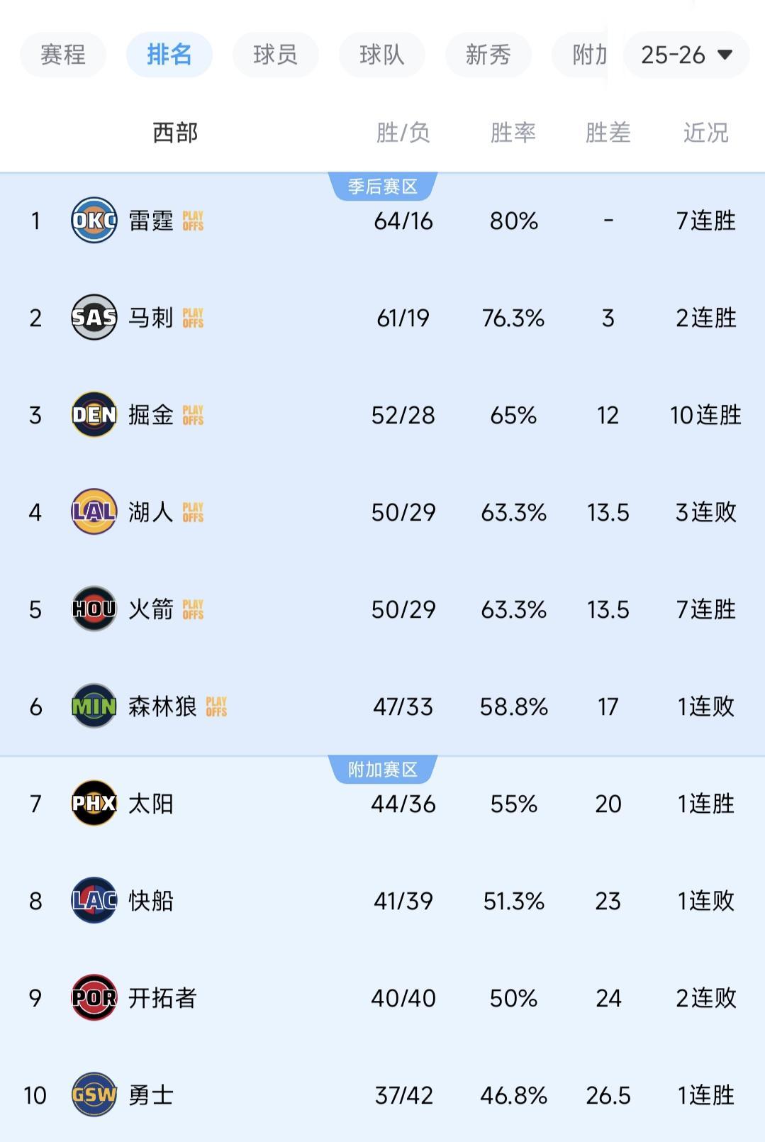 雷霆7连胜锁定西部第一!掘金10连胜紧追,西部最新排名及季后赛形势分析