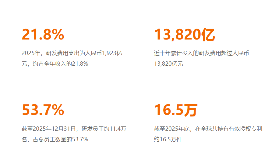 从财务数据可见端倪:2025年华为研发支出达1923亿元,占全年营收比例高达21.8%。近十年累计研发投入突破1.38万亿元,这个数字不仅超越国内绝大多数企业总和,即便放在全球科技巨头中也属罕见。更值得关注的是,这种投入强度呈现出逐年递增态势,形成独特的"华为式创新曲线"。