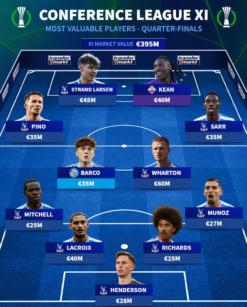北京时间4月9日,随着欧协联1/4决赛首回合赛事的临近,徽声在线从权威转会数据平台德转处获悉,该平台已正式公布了本阶段8支参赛球队身价最高的11人阵容名单。令人瞩目的是,水晶宫俱乐部共有9名球员成功入选,而剩余两个席位则分别由佛罗伦萨前锋莫伊塞-基恩和斯特拉斯堡中场巴伦廷-巴尔科占据。