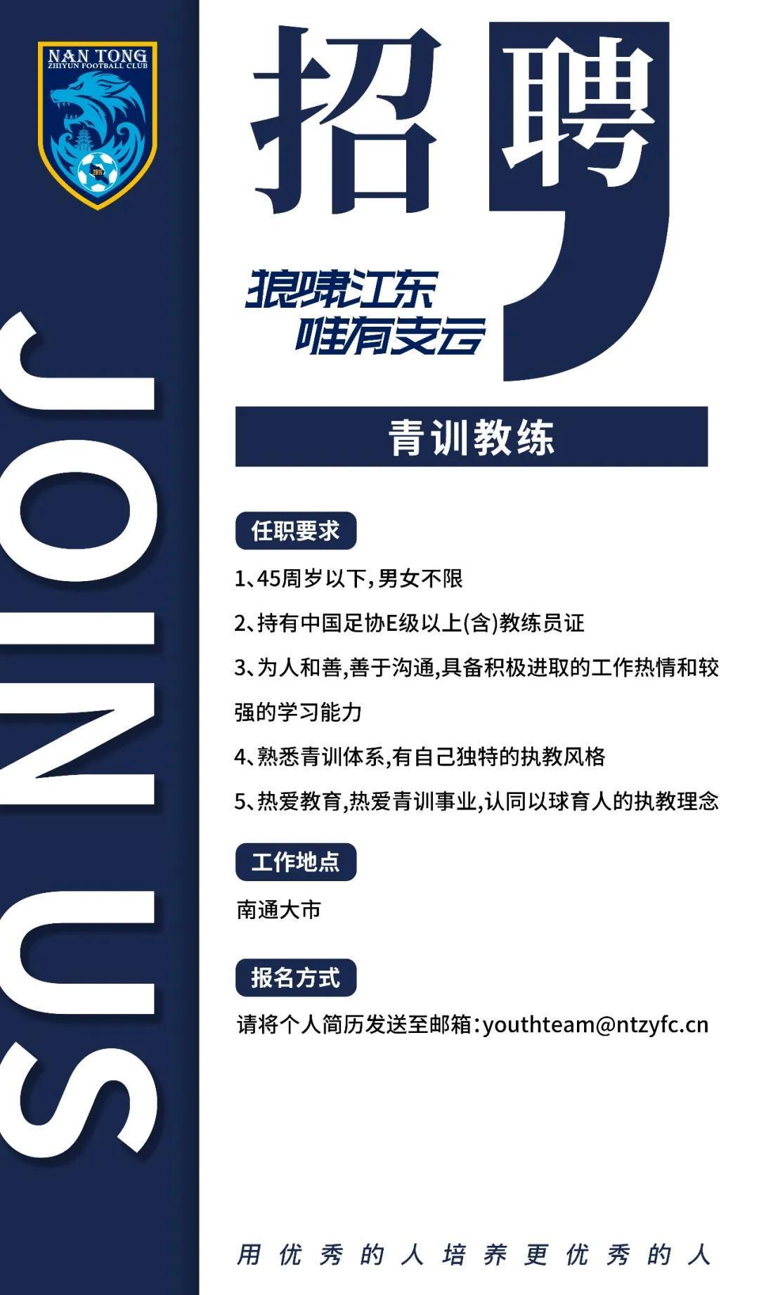南通支云,作为南通足球的领军力量,始终致力于扎根南通本土,深耕足球青训领域。为了进一步推动俱乐部青训体系的完善与升级,夯实南通足球的人才储备基础,并助力青少年足球事业迈向更高质量的发展阶段,南通支云足球俱乐部现面向全社会发出诚挚邀请,公开招聘青训教练及青训守门员教练。我们期待那些对足球充满无限热爱、专业技能扎实过硬的教练们能够加入我们的大家庭,共同携手培育出一批批绿茵场上的新星!让我们以青训为基石,共同构筑南通足球辉煌灿烂的明天!
