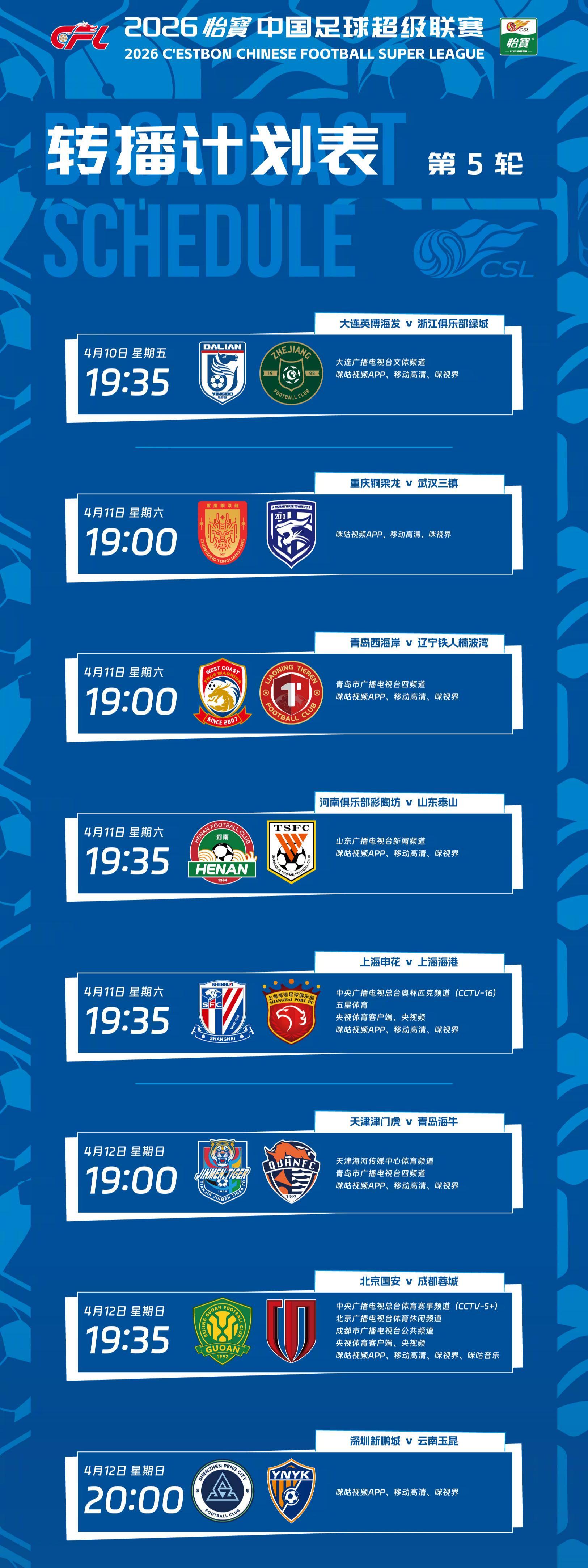 2026赛季中超联赛第5轮的较量将于4月10日至12日全面打响。赛前,中超官方已正式公布了本轮赛事的转播安排。根据最新转播计划,本轮全部8场对决均会通过各大网络平台进行直播,其中6场关键赛事还将登陆电视荧屏,为球迷们带来全方位的观赛体验。