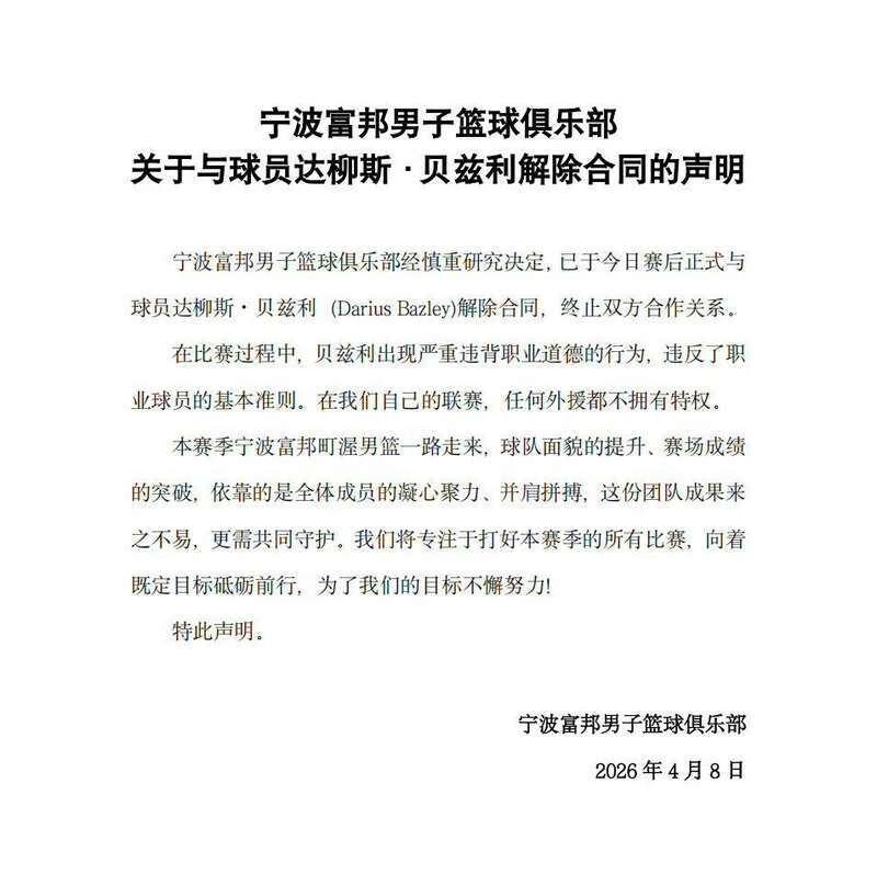 徽声在线讯(记者 陈宇轩)4月8日晚间,CBA赛场突发意外事件,宁波男篮在当晚比赛结束后立即宣布与外援达柳斯·贝兹利终止合作,俱乐部在公告中明确指出该球员存在「严重违反职业体育精神」的行为。