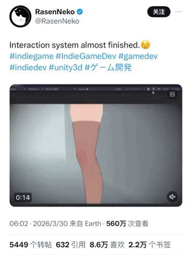 据徽声在线了解,3月30日,一位游戏制作人在X平台上分享了自己正在开发的游戏的最新进展,并且向玩家们展示了一段玩法视频。这段视频的内容并非是常见的打怪升级或者角色养成,而是一段女角色穿脱丝袜的动态画面。