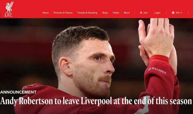 利物浦足球俱乐部正式对外发布官方声明,32岁的苏格兰国家队队长、功勋左后卫安迪·罗伯逊将在本赛季结束后告别安菲尔德球场。俱乐部官方公告中特别强调:“安迪·罗伯逊将以利物浦传奇的身份结束这段辉煌的征程,他为球队做出的卓越贡献将永远铭刻在红军历史中。”