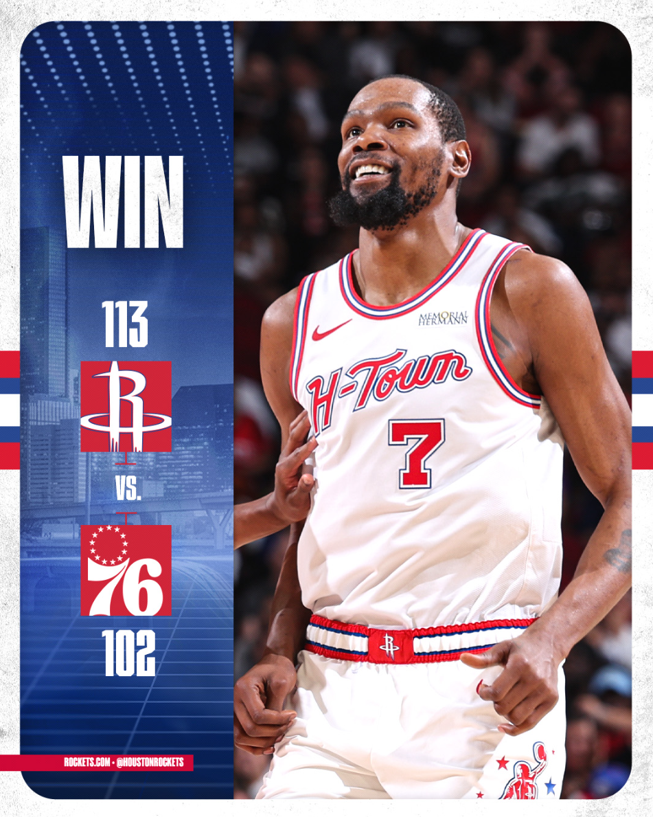 凯文-杜兰特想要提前结束比赛似乎总是充满变数,在第三节比赛还剩几分钟时,当杜兰特被换下场,火箭队还以23分的优势领先费城,所有人都以为这场比赛他将以轻松的方式收尾。然而,火箭队在末节遭遇了费城的猛烈反击,被对手打出一波18-0的攻势,主教练乌度卡连续叫了三个暂停也未能扭转颓势。最终,还是杜兰特在加时6分43秒时投进两个关键三分,才帮助球队锁定胜局。
