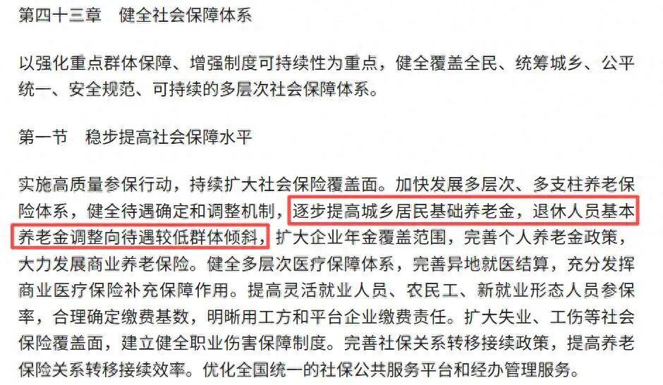 在规划第四十三章“健全社会保障体系”第一节中,明确提出“逐步提高城乡居民基础养老金,退休人员基本养老金调整向待遇较低群体倾斜”的政策导向。这一表述虽简短却蕴含重大信息,预示未来五年两类退休群体将迎来养老金涨幅倾斜。